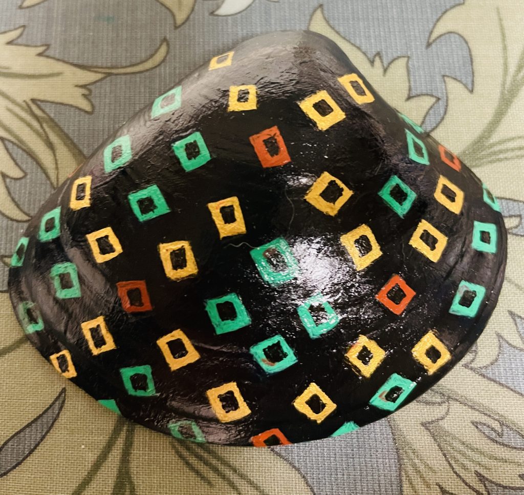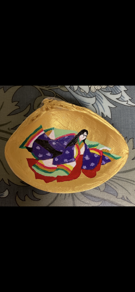 よく見かける貝合わせの絵付けみたいに幻想的に描きたかったのに 縁どりをしてしまったために イラスト的になり 納得のいく出来栄えではありませんが せっかくなので机の上に置いて 飾っています。
